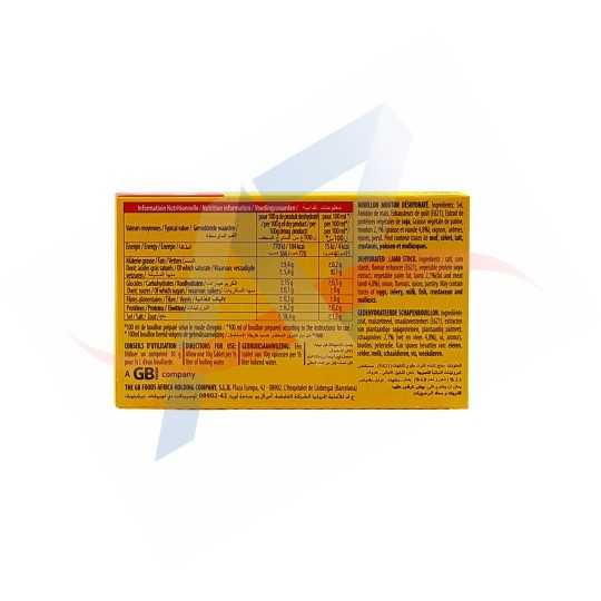 المكونات: ملح معالج باليود 51٪ ، محسنات النكهة: غلوتامات الصوديوم ، غوانيلات الصوديوم ، إينوزينات الصوديوم ؛ نشا ، سكر ، زيت نخيل مكرر ، شراب جلوكوز ، نكهة دجاج ، بصل ، كركم ، ماء ، كرفس ، مستحلب: ليسيثين الصويا. يحتوي على: فول الصويا والكرفس.